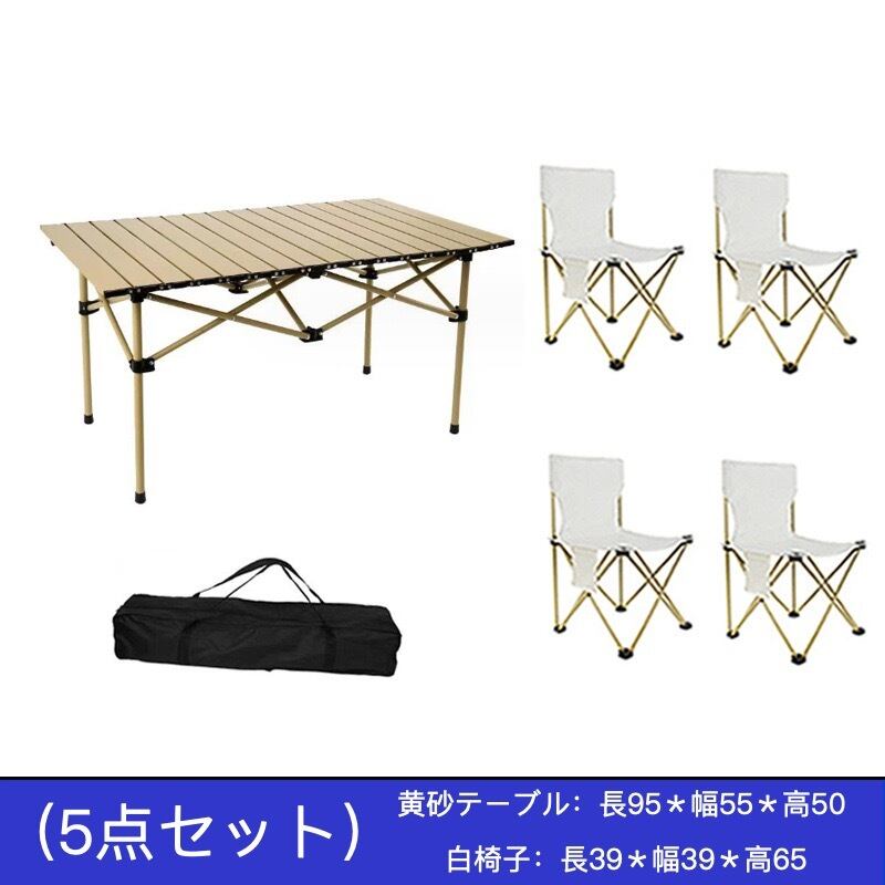 アウトドア 折りたたみテーブル ロールテーブル 簡単組立 コンパクト 収納バッグ付 バーベキュ シリーズ2 95CM黄砂テーブル/白椅子/5点セット