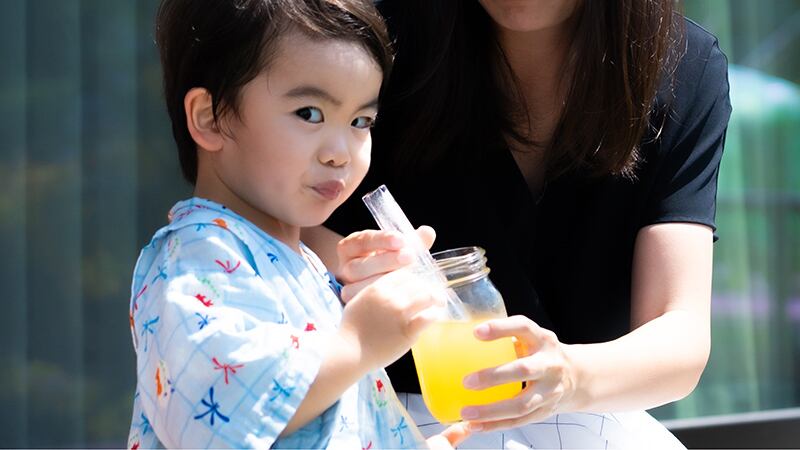 Step1.水やジューズなどを約2/3まで容器に入れからスティックを穴に差し込む