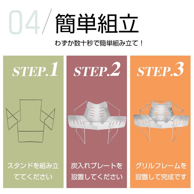 複雑な工程は一切なし。スタンドを組み、炭入れプレートを設置し、最後にグリルフレームを載せるだけ。わずか数十秒で調理・焚き火準備が完了します。