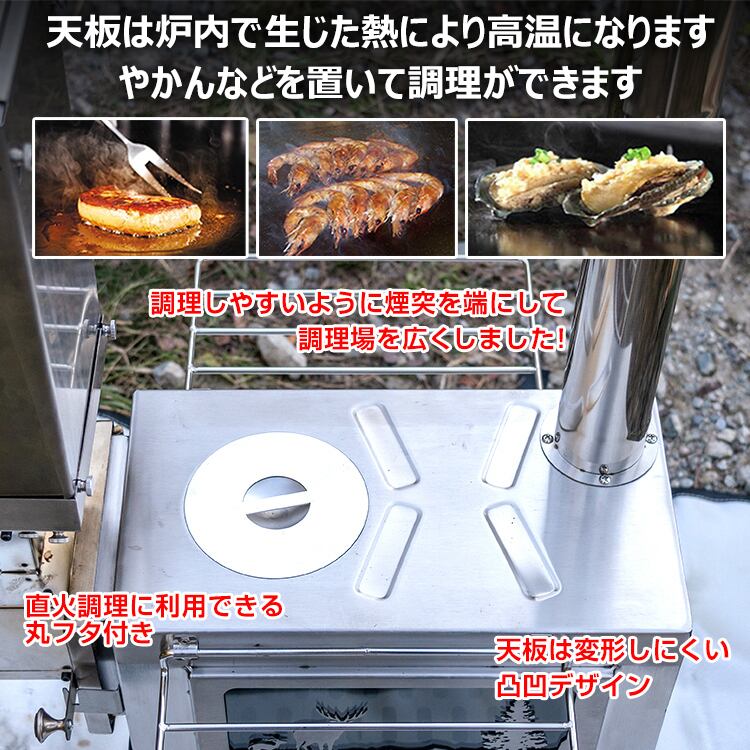2面ガラス窓付!ステンレス製 薪ストーブ | 連結式煙突・ステンレステーブル付属